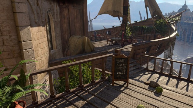 The Blushing Mermaid Tavern is unmistakable because it has the bow of a ship jutting out of it. Head inside to investigate.