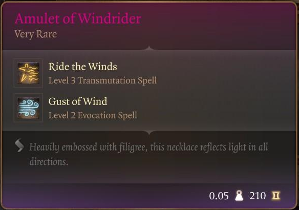 Amulet of Windrider (very rare), which gives you Ride the Winds and Gust of Winds, and Duelist’s Prerogative, a legendary sword that gives Challenge to Duel and Dueler’s Enthusiasm (legendary).