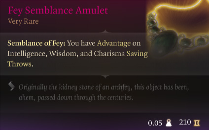 | Fey Semblance Amulet | You have Advantage on Intelligence, Wisdom, and Charisma Saving Throws. |