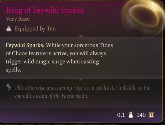 | Ring of Feywild Sparks | While your sorcerous Tides of Chaos feature is active, you will always trigger wild magic surge when casting spells. |
