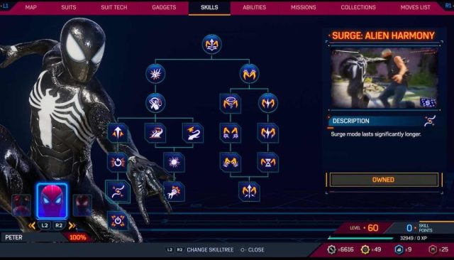 All the images below display the different Symbiote suit upgrades needed to speed up the hunt for the Surge Trophy. Some skill upgrades will cost one skill point, while others will cost two skill points.
