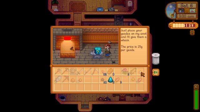 Once you have a Mystery Box, you’ll need to go to Clint the Blacksmith on the far east side of town, just above the museum. Speak to him and select the “Process Geode” option to crack open the Mystery Box.