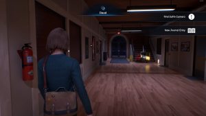 After your initial dialogue interaction with Detective Alderman, head over to the hallway on the right, and switch to the “Living” timeline by interacting with the gateway next to the janitor cart.