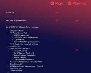 F1 25 is also part of the EA Play Pro service which is available exclusively for PC players. If you’re subscribed to the regular EA Play service, you can enjoy a five-hour free trial of F1 25. If you have EA Play Pro, the F1 25 Iconic Edition will be added to your library automatically. Here is a comparison chart of what both subscription services offer.