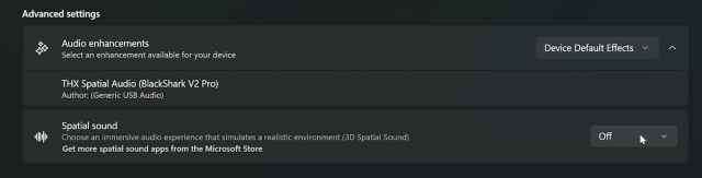 - Here, locate your output device and click on it. Scroll to the bottom and under “Advanced Settings” set Spatial Audio to “off“.
