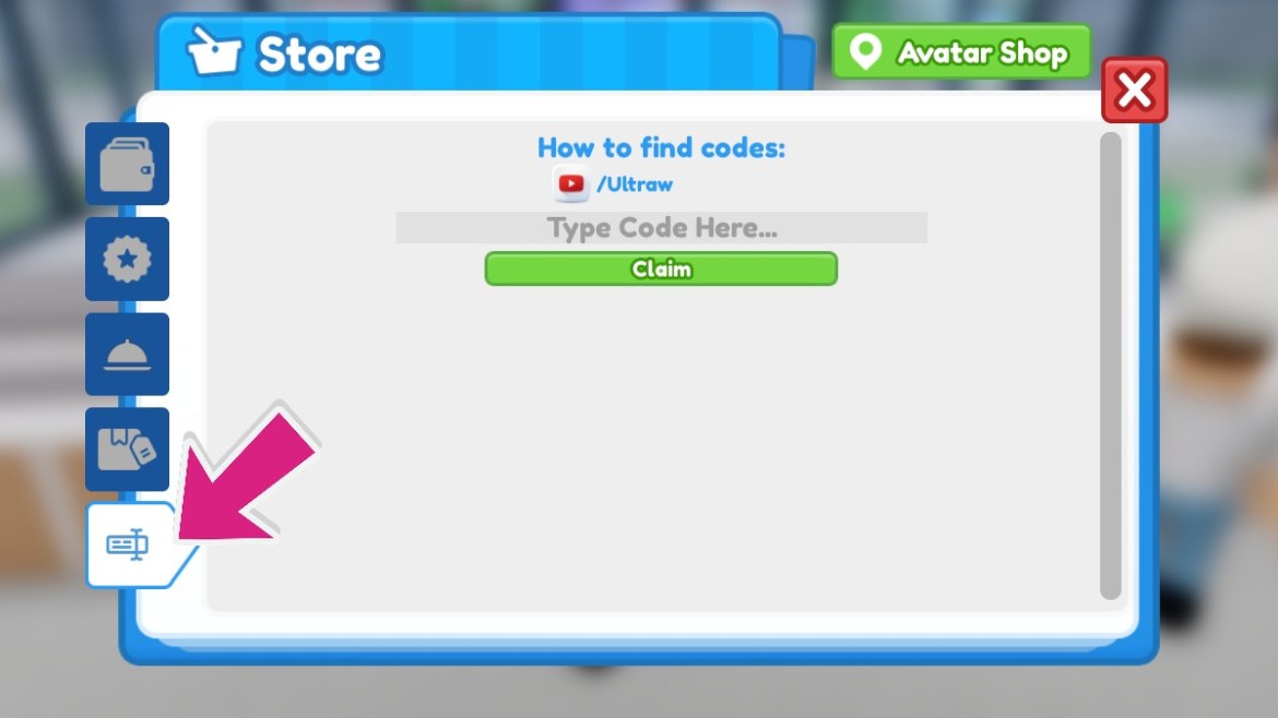 If you’re hoping to redeem any of the codes listed above, you’ll have a few steps to take before you can claim the goodies inside. You’ll first need to click on Store or use the 6 key on your keyboard to open it. Once the store has opened, you’ll want to click on the codes tag on the left side menu, seen in photo 2. After this screen is shown, you’ll just need to type in the code that you would like to use, and you’ll be ready to go.