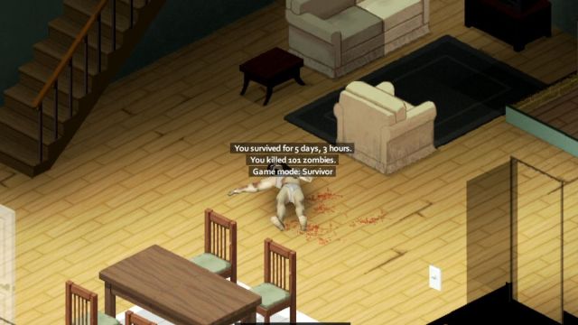 The next character lived for a day and 2 hours before a missed swing with a bat led to death after killing just 21 zombies. And, finally, I got the hang of it, since my next character managed to establish a safehouse, gather plenty of food and meds, and enough weapons to kill all the zombies in town.