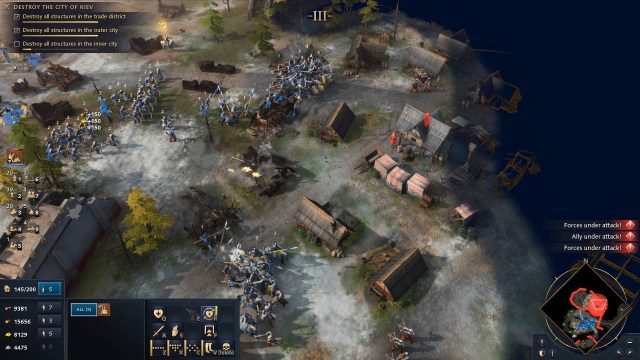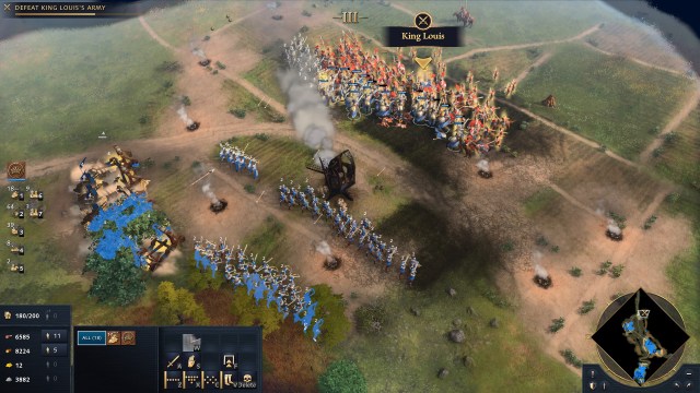 Seriously, the scent of history hindsight is so strong in these games that you could almost conclude these old-timers waged war for lack of anything better to do. Rich people problems aside, you will learn a lot from playing Age of Empires IV, which almost feels like playing through a documentary straight off of The History Channel, but with fewer aliens. You are able, of course, to skip these bits at any time and jump right into the action. These battles consist of the tried-and-true scenarios that are part-and-parcel of the RTS scene. Your guys are blue, the bad guys are red, allied or neutral units are yellow or white. You will either be attacking, defending, or completing a specific task, such as the building of a wall or the flanking of an overwhelming foe. There is almost always a secondary objective or back route to complete your main task.
