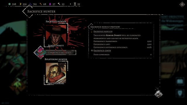 Speaking of corruption, just like Wardens in Dragon’s Age, the Hunters pay dearly for their half-breed nature. Each of them will accumulate more corruption as you play. If they reach a breaking point, they snap, dealing damage to other hunters, and die. You prevent this by doing two things: not getting an excessive amount of corruption and sacrificing your old, corrupt hunters to transfer their XP to freshly hired replacements.