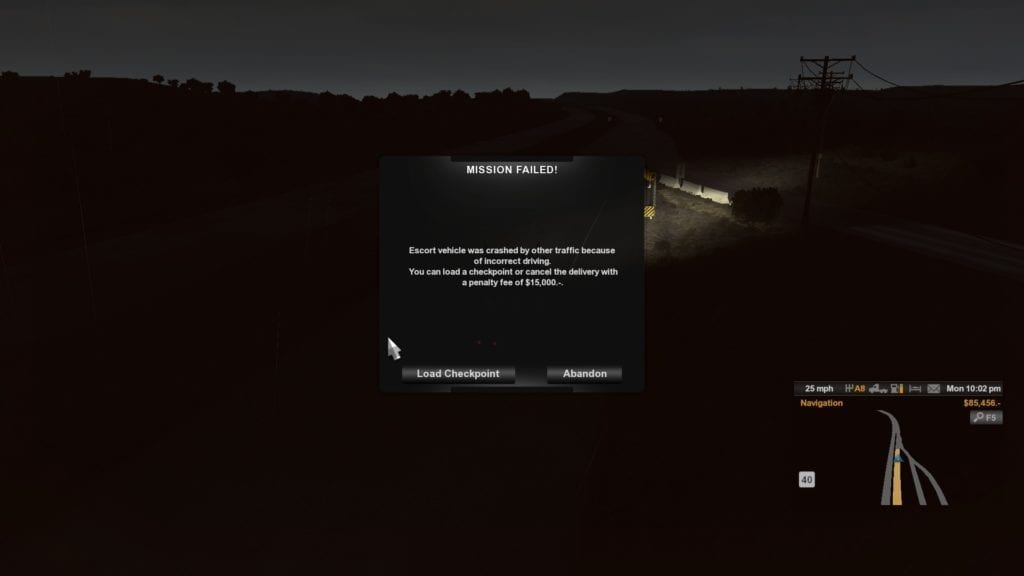 Thankfully, there’s a checkpoint system which activates every few minutes. Still, it’s annoying to have to do a minor restart due to mishaps beyond my control. I never really encountered such issues when playing the ETS 2 version of the Special Transport DLC. My version of ATS isn’t modified either, so I’m not quite sure what was going here. Hopefully, this can be tweaked.