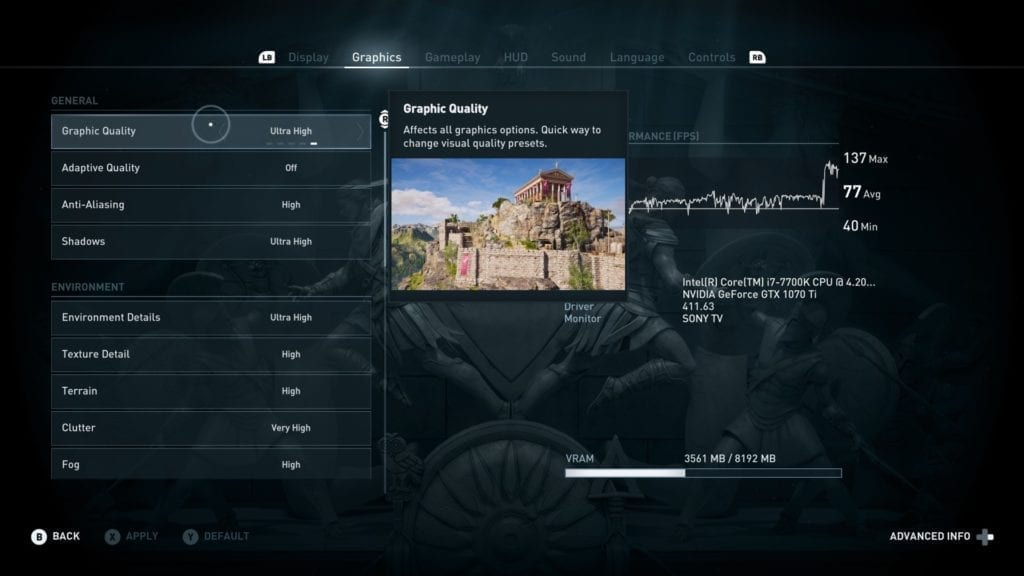 For reference, I just used the Ultra High preset after a quick benchmark determined highly satisfactory performance results. Also worth mentioning are the five available presets outside of personal customization — Low, Medium, High, Very High, and Ultra High. Adjusting different settings also shows a small comparative image of what a certain scene may look like depending on the changes you’ve made.