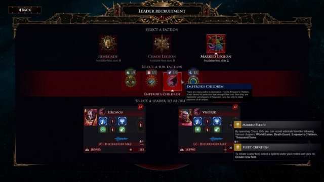 Chaos Legions – These represent your own brothers from the Word Bearers, as well as the Alpha Legion, Iron Warriors, Night Lords, Black Legion, and the Red Corsairs — Loyalist Space Marines that became a renegade chapter, now engaged in piracy and murder. Admirals recruited from this pool have a couple of skills.