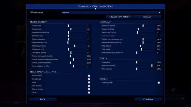 First, let’s talk about the other major addition to Battlefleet Gothic: Armada 2‘s single-player campaigns — the new gameplay options. Prior to starting any campaign, you’ll be able to tweak various mechanics. You can increase your fleet capacity and renown gain. You can also change the boosts received by the AI, from their propensity to assault your systems to how often they build defensive structures. There’s even the option to turn off the urgency meter, allowing you to progress through Battlefleet: Gothic: Armada 2‘s campaign at your leisure.