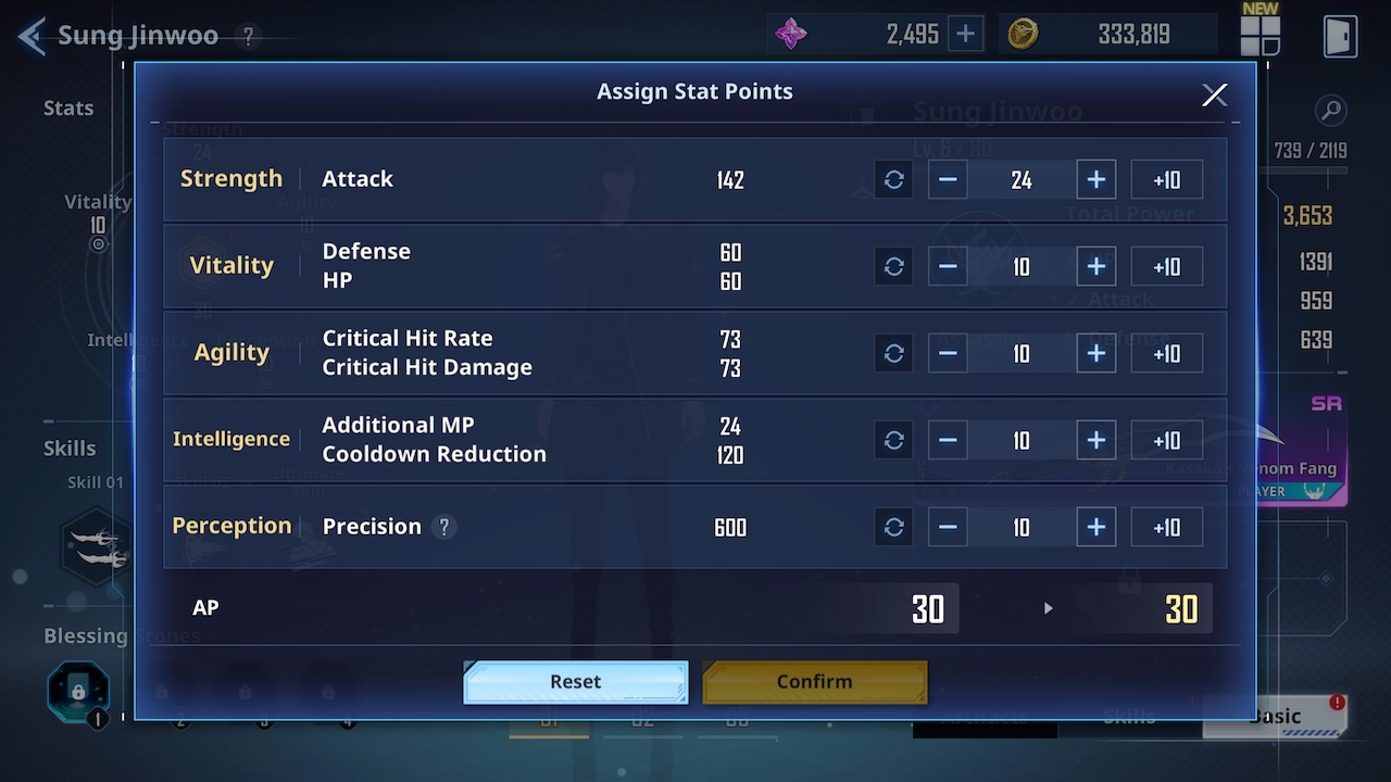 Stats play an important part of any character’s build, especially for Sung Jinwoo. The most important Stats to focus on for Jinwoo have to be Strength, Agility, and Perception.