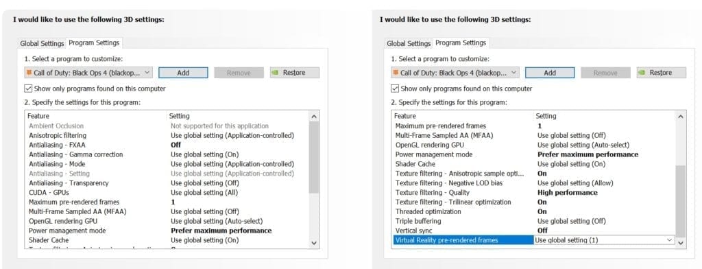 Let’s go take a look at the options from my Nvidia Control Panel. From the Nvidia Control Panel, navigate to “Manage 3D Settings” then “Program Settings” and choose/add Black Ops 4. Set the options you see in the image above. For AMD users, set the corresponding options on your Catalyst Control Center.