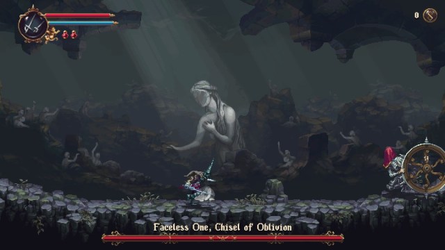 Combat applications aside, however, the most exciting thing about Blasphemous 2’s weapons is the way in which they also serve as items, in the traditional Metroidvania sense. One of the defining features of the genre is the loop of encountering an obstacle you can’t surpass, exploring, finding a new item, and using that item to progress beyond the obstacle you found previously. In modern game design parlance, these items effectively serve as keys for specific types of locks in the game world, and in Blasphemous 2, your weapons are keys too. Though not in the literal, Kingdom Hearts sense. Veredicto can ring bells to summon platforms, Sarmiento and Centella can let you make use of teleportation mirrors, and Ruego Al Alba can break through writhing barriers. Each of these abilities is required to navigate a particular area and defeat a particular boss in the early game, meaning your choice of starting weapon is also a choice of starting path. On subsequent playthroughs, you can leverage this knowledge to plan out your route through the early game, prioritizing zones with relevant items for your style of play, but in the end you will gain access to all three weapons before you pass through into the mid-game: a nice touch that prevents playthroughs being condemned through a poor initial choice.
