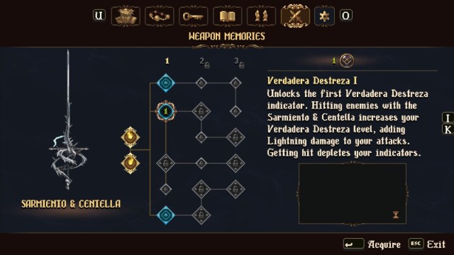 Thankfully, things pick up once you push past the opening scene. After waking up from a nice nap in a coffin, the Penitent One rolls out of bed and strolls on over to the right, where one of the most important decisions in the game awaits: which of the three starting weapons will you choose? This is a major change from the original game, where the Mea Culpa sword was your one and only option for the duration of the game, and it’s one that carries the same kind of energy as choosing a starter in Pokemon. Do you opt for the slow-but-powerful Veredicto mace, the swift dual blades Sarmiento and Centella, or the well-balanced Ruego Al Alba sword? Each has its own moveset, special abilities, and, in a decision that serves only to further the Pokemon analogy, its own elemental alignment. Game Freak should take some notes, too: we think the next Pokemon game would be much more interesting if players could choose between the fire, lightning, and blood types Blasphemous 2 offers rather than their usual options.