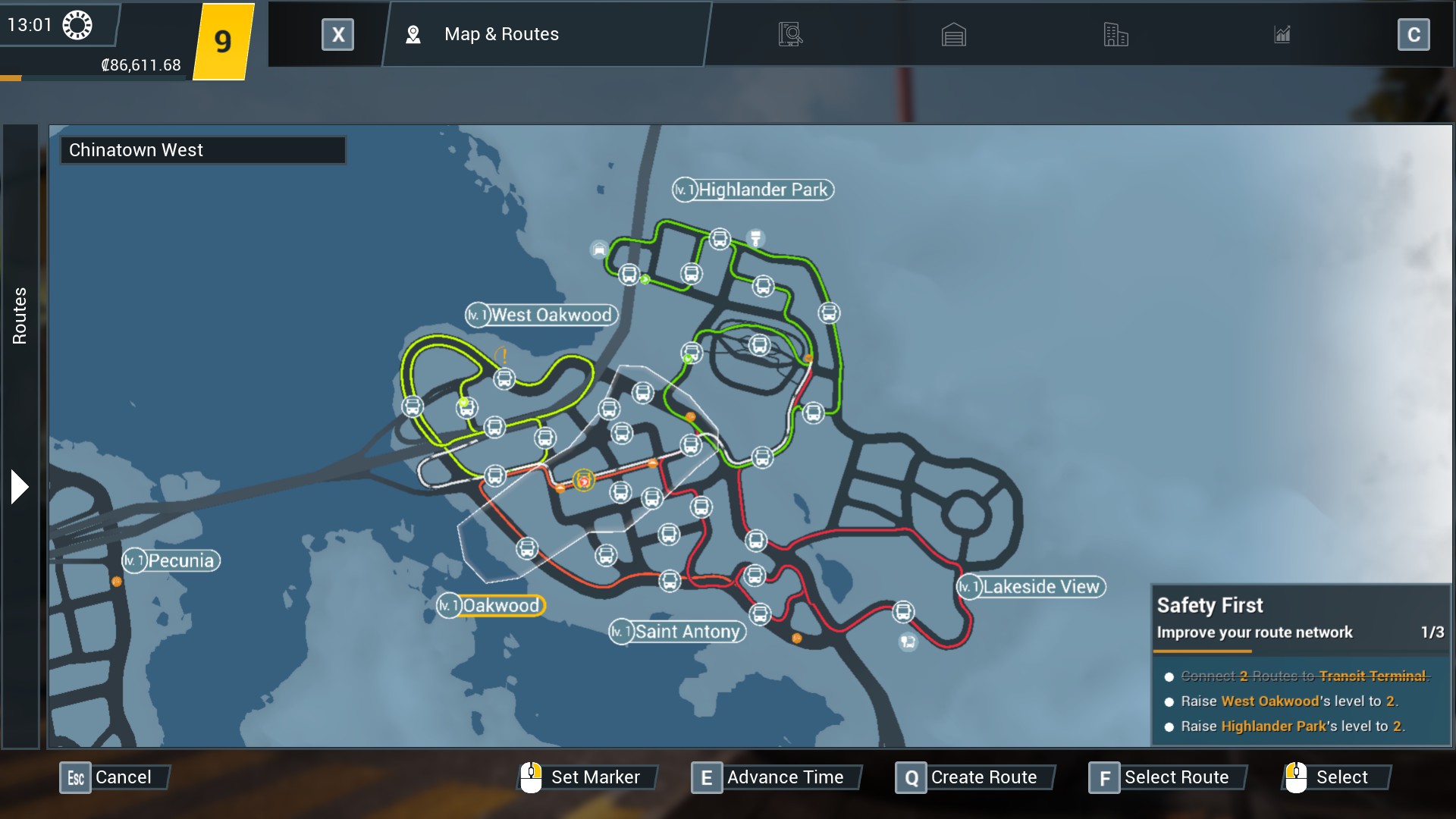 Each bus stop has a different level of demand and different peak hours. Routes will be considered “balanced” if the most compatible stops are chained together. For example, having a route that consists of three low-demand stops and three high-demand stops will be balanced. But, three low-demand stops with just one high-demand stop will be unbalanced. Alternatively, a route of six stops with five of them peaking at night would be more profitable than two of them being in high demand at night and three being high-demand in the day. Some quests will specifically require routes to be nighttime or daytime oriented, whereas others specifically ask for certain stops to be included.