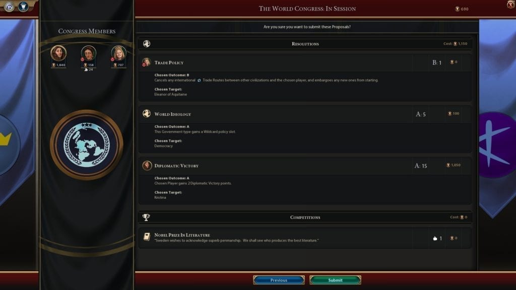 The mechanic looks intriguing on paper until you realize that it’s poorly implemented. For one thing, you can’t select the next set of proposals that would be available for the upcoming convention. You also can’t coerce the AI into voting for certain proposals you want — a tooltip will say that an AI might like a proposal, but it won’t tell you how much Diplomatic Favor they’ll spend. You’re even free to ignore this mechanic completely especially if the AI ends up using its own points for something that you’d prefer.