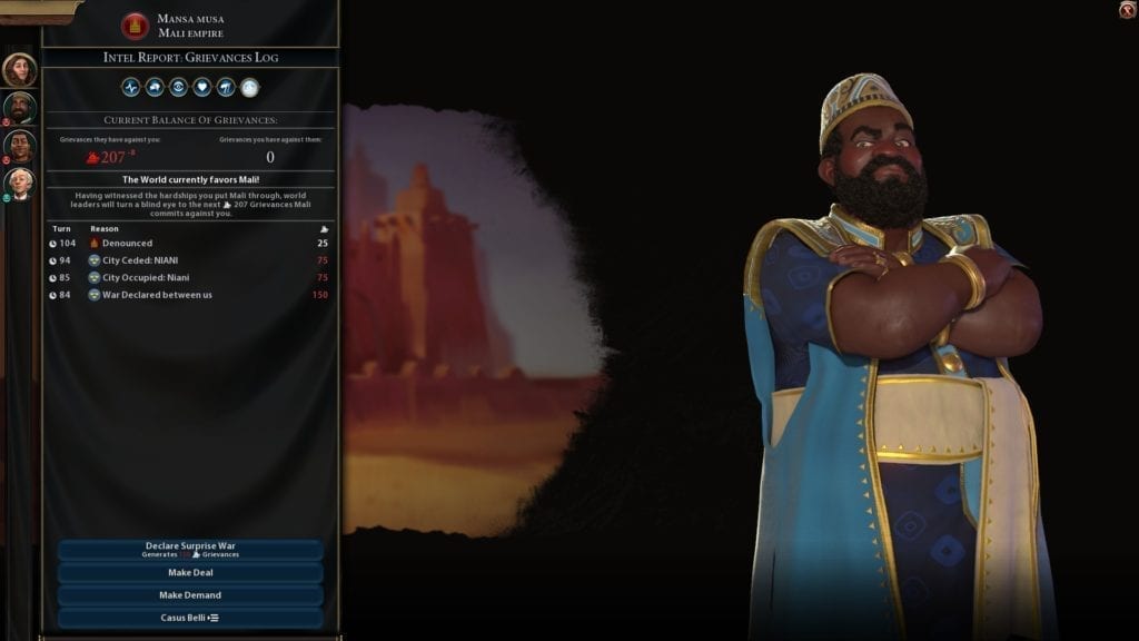 With the new Diplomatic Victory condition and the Grievances mechanic, war tends to mean absolutely nothing. The more aggressive the AI is, the more Grievances you’d have against them. You can then “cash in” these Grievances to denounce or use different types of casus belli for war.