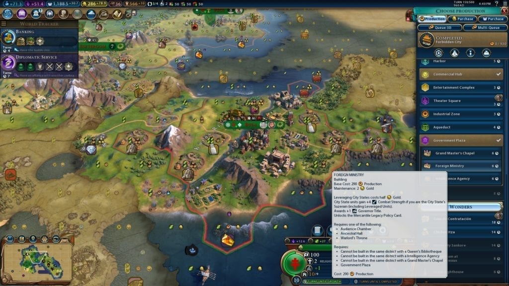 - Ensure that you have decent gold generation to keep up with your spending habits. Build a Foreign Ministry in your Government Plaza to halve the costs of levying units.