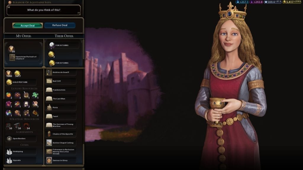 “Franleonor” gains the perks that France had (save for Catherine de Medici’s espionage bonuses. This means increased production for later era wonders, along with the Chateau improvement. A challenge that players are doing now is going for world domination… all without capturing a single city with your military.