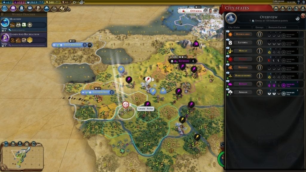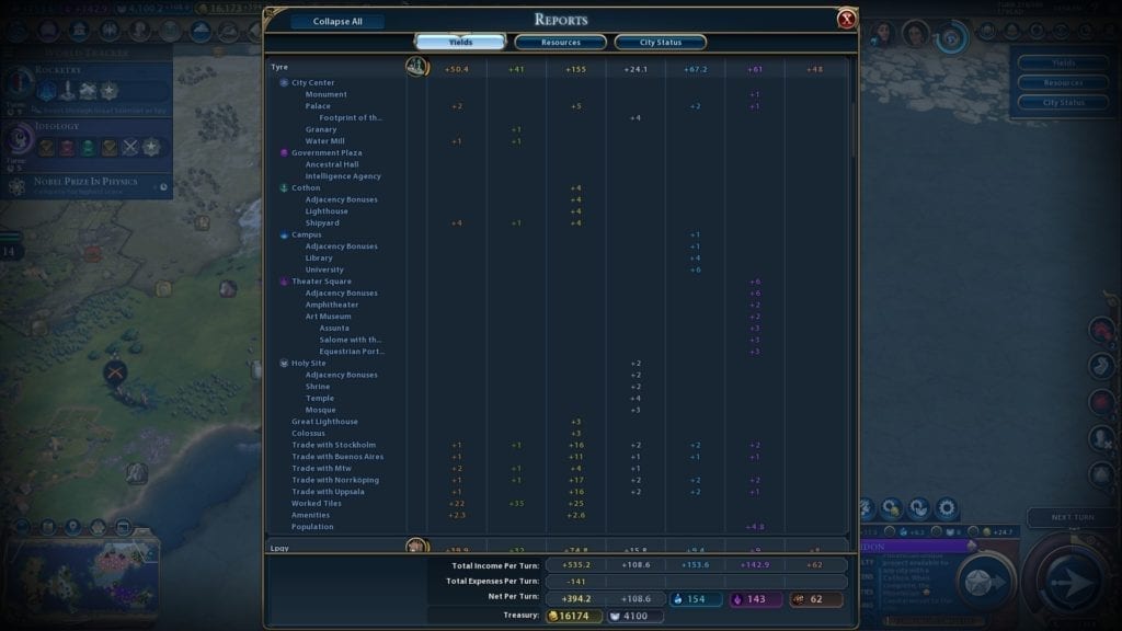 A prime reason why I considered her a strong civ in the preliminary tier list was because of how you could “game” Gathering Storm’s system with the Casa de Contratacion wonder plus the Colonial Taxes policy. With both, you should see a massive boost to your cities in other continents after you switch your capital. That wasn’t a clear-cut case in my playthroughs. Since the wonder only helps cities with a governor, not every settlement you have gains a benefit. I was already lagging behind, and improving my cities took a while. Switching my capital actually led to a drop in overall yields.