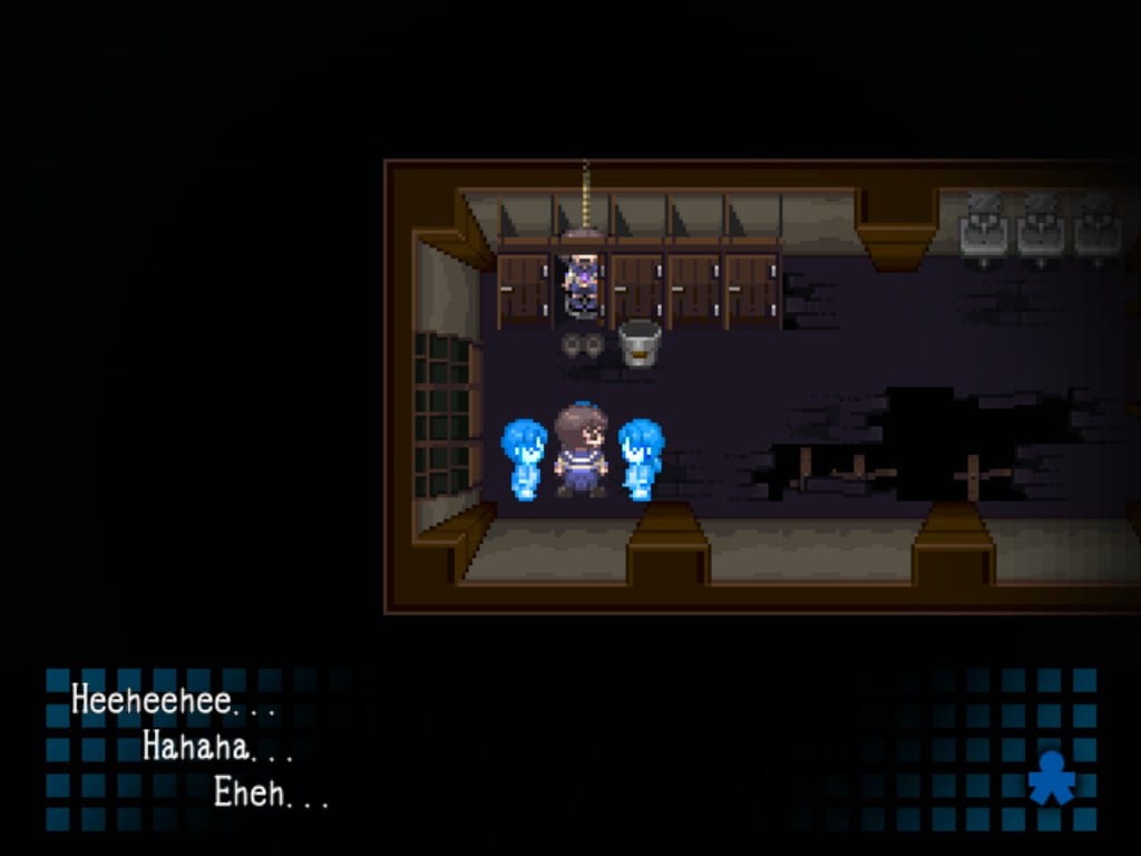 We do have one advantage, which is that the PC Corpse Party contains a few scenes and endings (bad endings, mostly) that aren’t in the handheld versions. Whether or not that’s worth the slight downgrade in graphics and the lack of event CGs, I don’t know; I haven’t played through the entire thing and can’t make a judgment call on that. We also have one bonus chapter from sequel Corpse Party: Book of Shadows converted into top-down RPG format (as Book of Shadows was more of a visual novel), which is a nice touch.