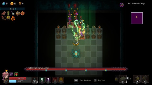 At the end of each floor, you’ll find a boss waiting for you. The bosses in Crown Trick all have unique spells and mechanics. One of them, Vlad, even has several variants. This includes an encounter with mechanics akin to “chess,” complete with pawns that transform into queens once they reach the opposite edge.