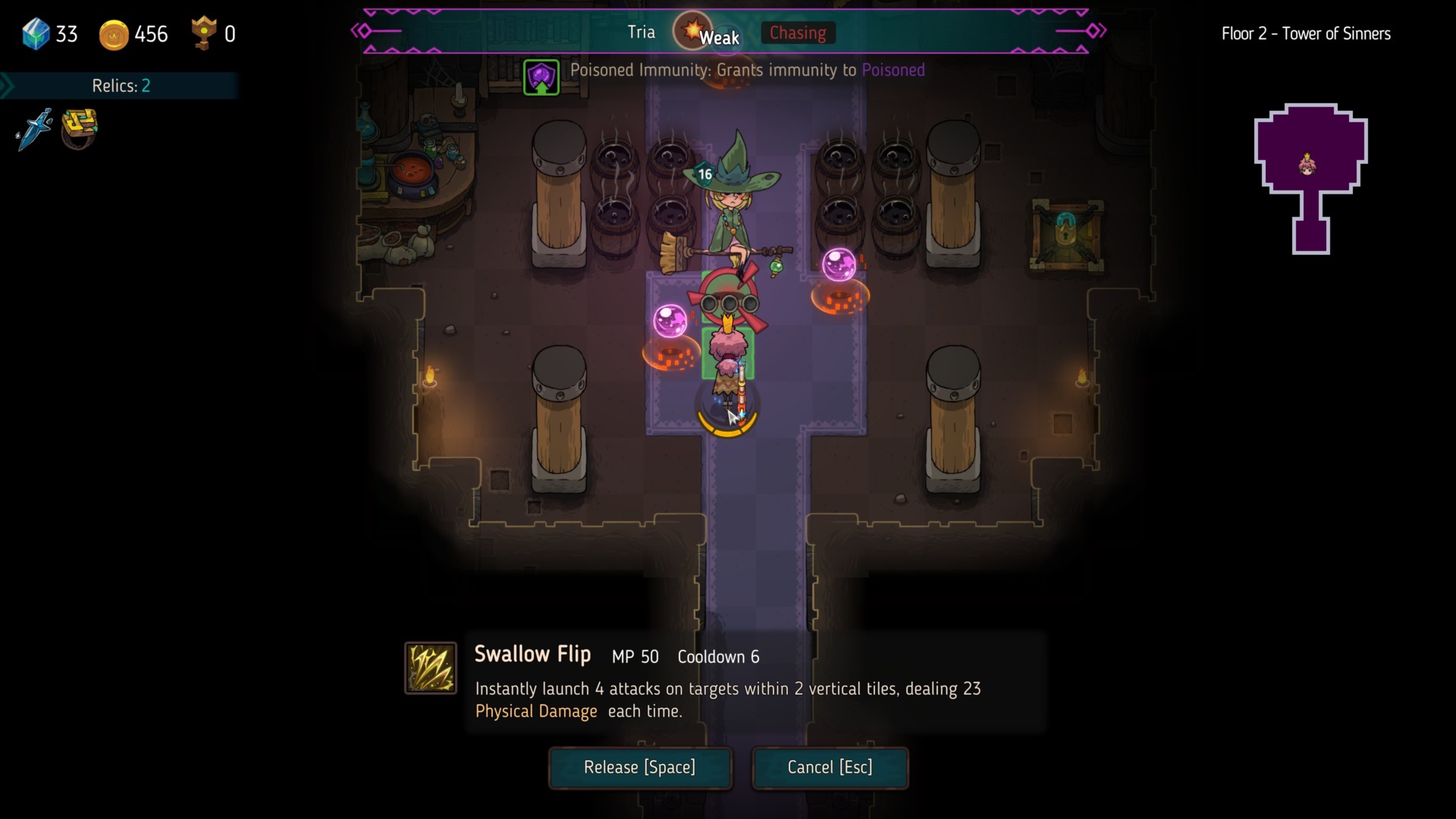 As mentioned earlier, Crown Trick uses a turn-based combat system. Whenever you enter a room with an enemy encounter, you move from tile to tile normally while hostile mobs do the same. I’m reminded of one of my favorite PlayStation 1 games — Azure Dreams — because of the dungeon delving and turn-based exploration.
