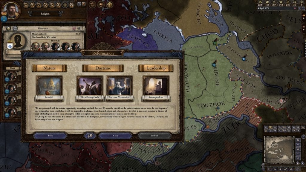 There are also deeper customization options if you wish to be a Reformed Pagan. A Reformed Norse society where everyone loves peace, women can hold the reins of power, and folks love some good, old-fashioned blood sacrifices? That’s Medieval times of being #woke, I guess.