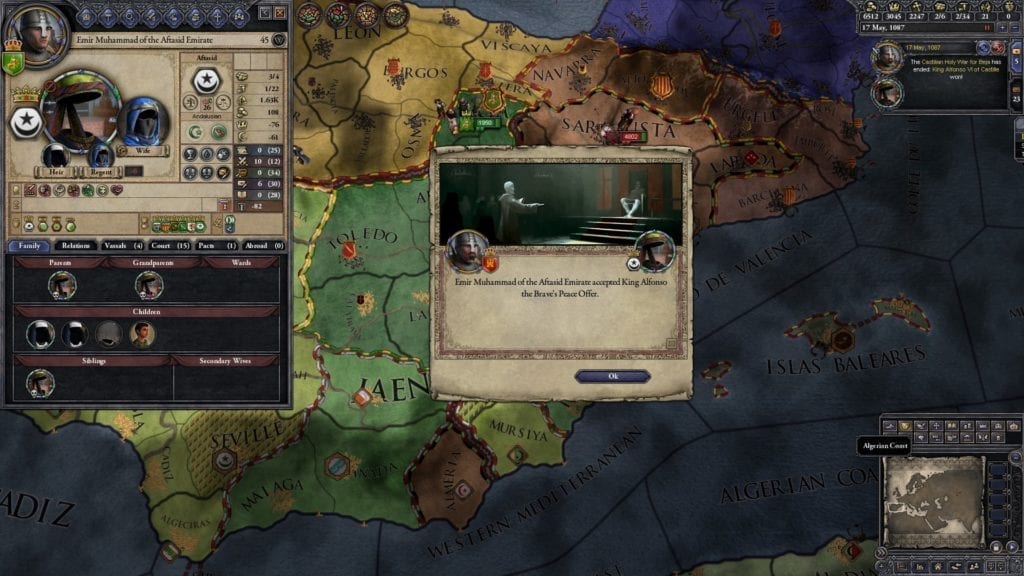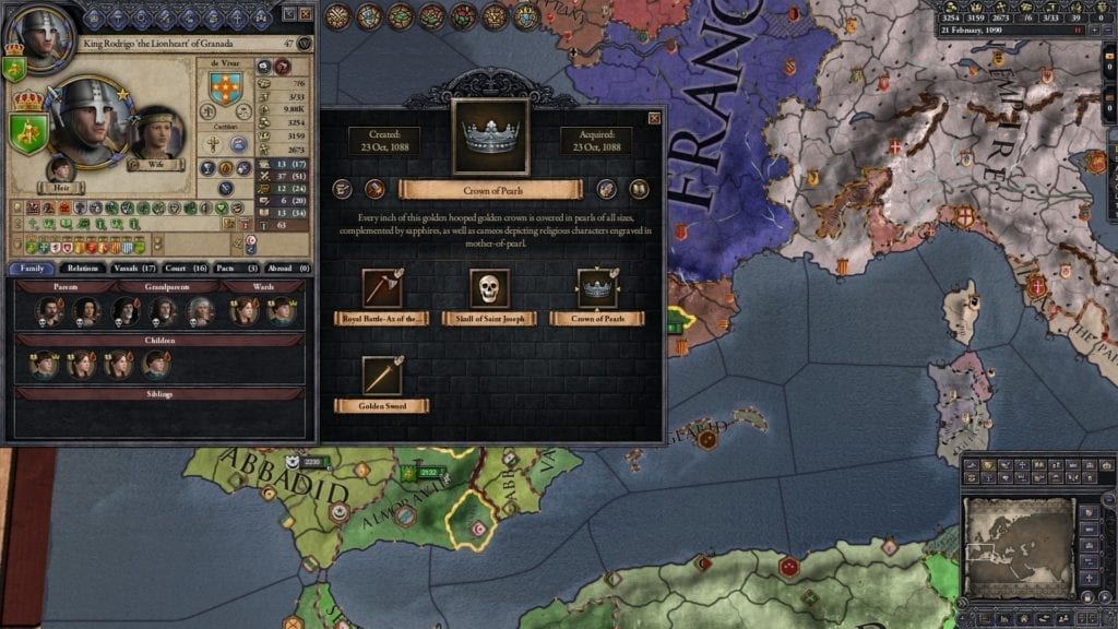 No longer a subject of my good friend, King Alfonso the Brave, I decided to get coronated. Since this is the legendary El Cid, I thought it’d be best to have the Pope crown me. My coronation went smoothly owing to a high opinion from the Pope, although I’ve heard that it’s possible for the Pope to send you out on an errand first before he crowns you (if relations aren’t high enough). Getting crowned also changes your portrait depending on the monarchic headgear, and you can even gain treasures.