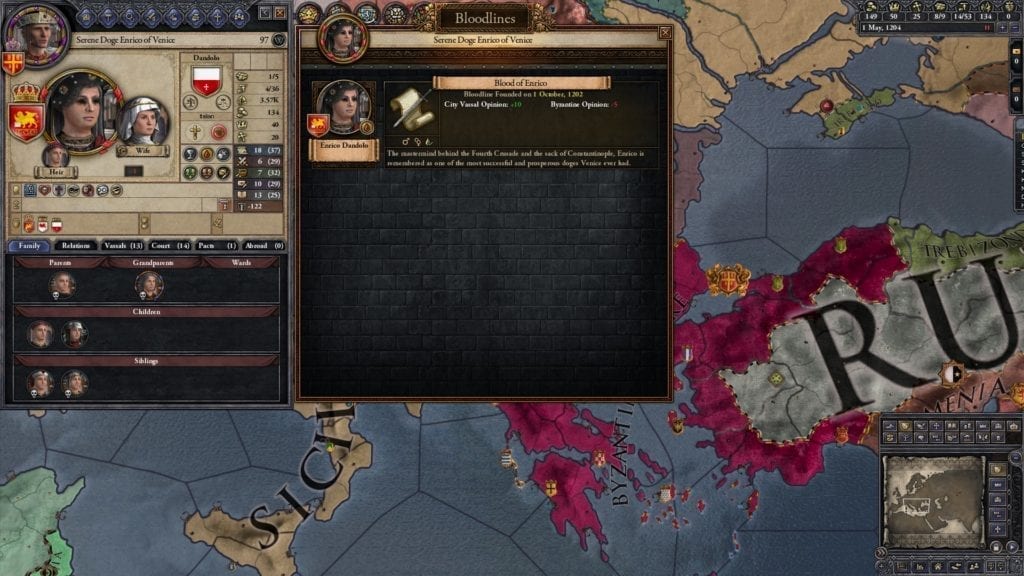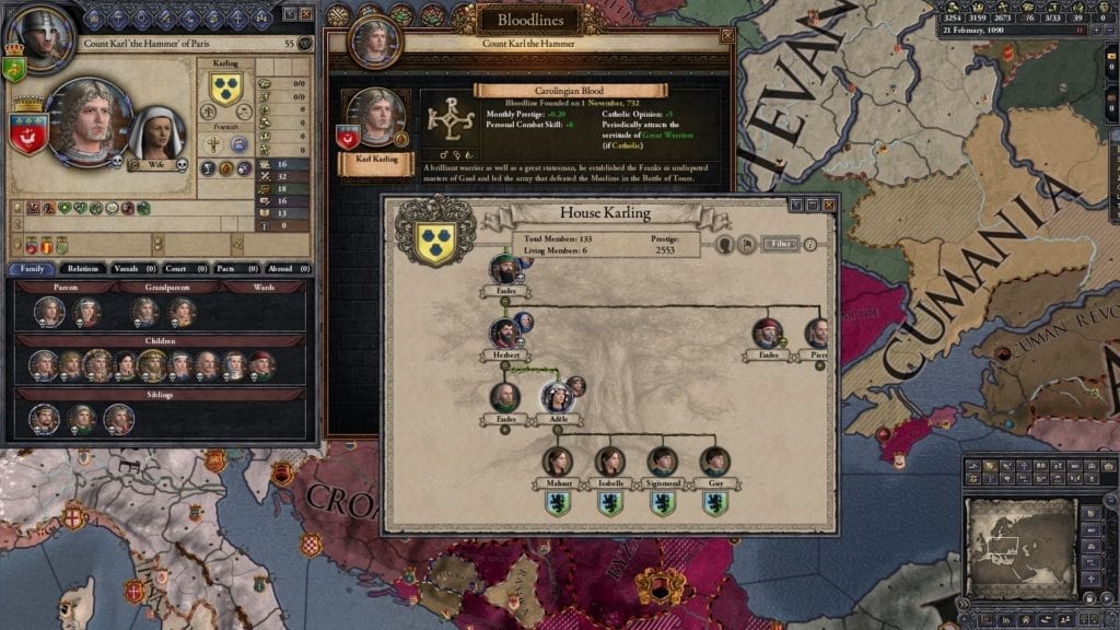 Also, the ledger allows you to check for existing Bloodlines and their living descendants. Finding a living character is as easy as clicking a few buttons on their panels. Through your actions, you can even create a distinct Bloodline of your own. Similarly, it’s also possible to revive a Bloodline that’s almost extinct (provided you can nab that character and create more descendants). Check out the Bloodlines for King Caradog of Britain as well as the Carolingian Bloodline:
