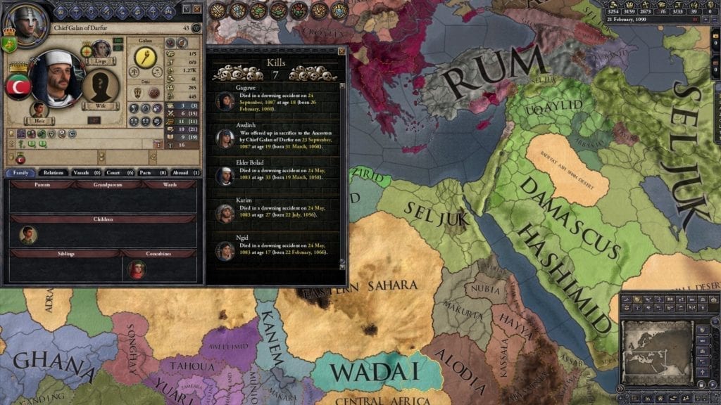 Since we’re talking about “blood,” another addition in Holy Fury is the Kill List. Crusader Kings II isn’t shy about characters murdering everyone just to position an heir or grab a title, and the Kill List exemplifies that. You can check character panels to see the characters they’ve killed and via which method. Were these people executed? Were they assassinated via a “drowning accident?” Perhaps they were offered to the gods? How about a duel to the death? Getting five kills lands you on that particular ledger as well.