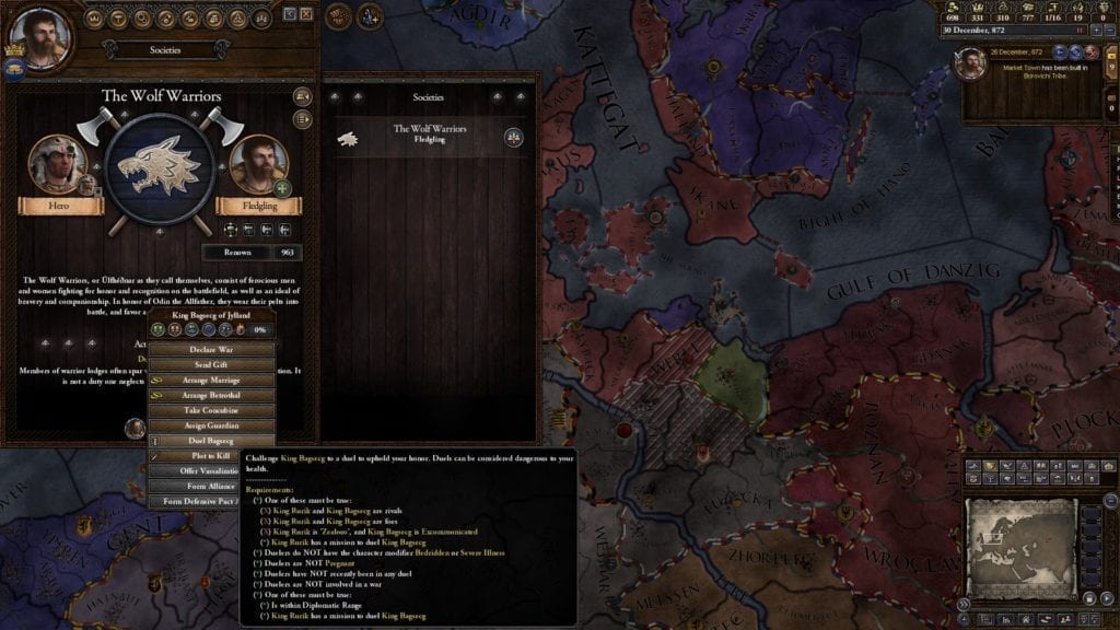 I was also part of the Wolf Warriors society as Rurik. Several of their missions had me dueling various Vikings across the lands. It was also very annoying since one of the requirements to duel someone was for them to not be at war. Since they’re damned Vikings, they were often at each other’s throats. In one case, I had to wait several months until the Petty King of Jylland finished his wars with Saxony and Sweden just so we could have a proper fight.