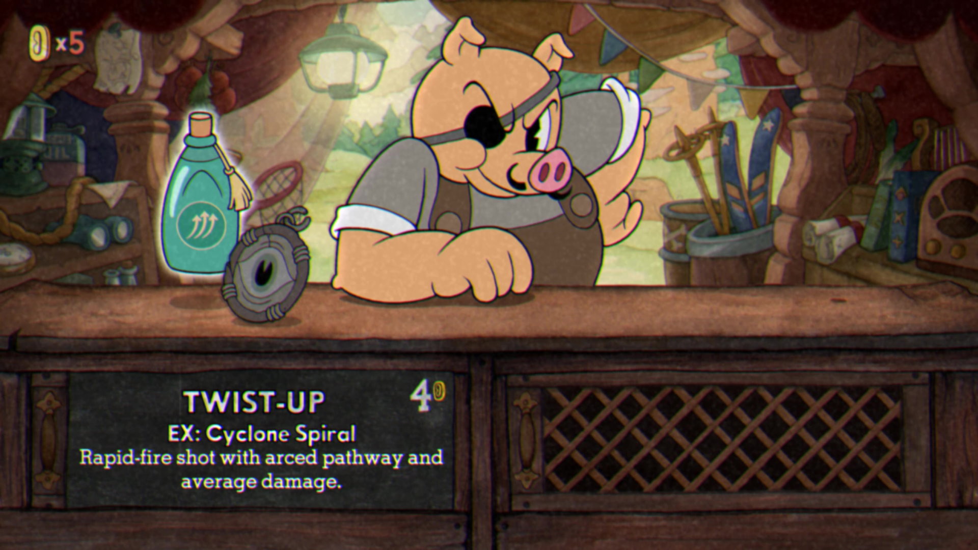 The one-eyed shop owner Porkrind also has more wares for sale. There are three more weapons and two Charms for sale. The Heart Ring gives a single health point for every one, third, and sixth successful parry, and Converge is a three-way shot of yellow electricity that narrows when you fire while your movement is locked down. My favorite of the new weapons has to be the Crackshot, a red diamond that breaks into a smaller projectile that tracks enemies. It’s perfect when you want to take aiming out of the guesswork.