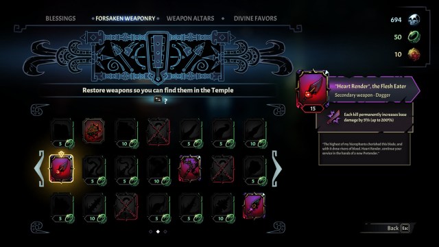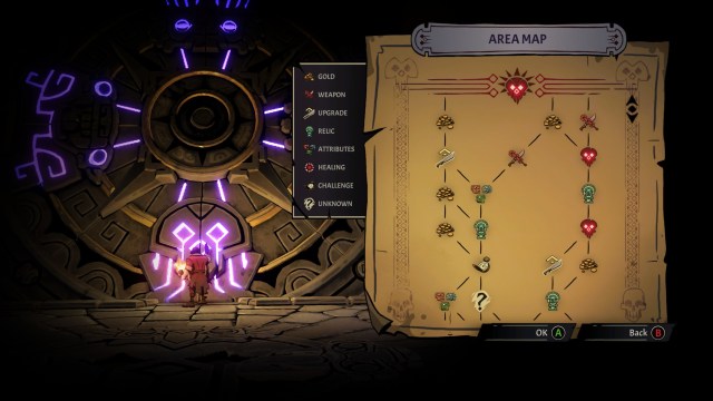 After finishing a dungeon run (or failing one), you’ll lose all your gold and boosted attributes. However, you’ll retain resources that let you unlock permanent perks and discoverable weapon types. You may also obtain altars that offer a selection of gear and “divine favors” (rerolls in case you want a different reward).