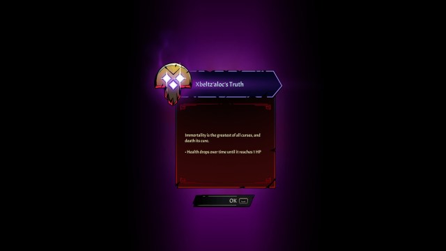 With how the mechanic is implemented, there’s a possibility that you’ll hit the fifth curse. This one’s no longer random, as it simply causes your health to drop until only one HP remains. Assuming you can’t find a means of lowering your corruption (i.e., relics or weapon perks), then you’ll find yourself at the mercy of RNG.