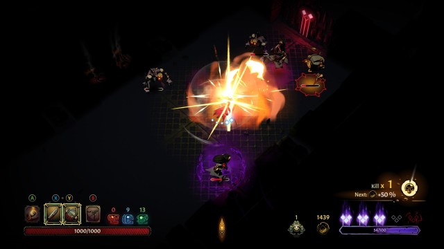 In terms of battling opponents, Curse of the Dead Gods has one of the most enjoyable combat systems I’ve experienced. It’s extremely skill based, with a steep learning curve that prioritizes high-risk, high-reward actions. Think of it as akin to Dark Souls and other Souls-like games given that you use your stamina to dodge and parry attacks. Time these right, and you’ll regenerate stamina (or in the case of parries, you’ll also stun enemies). Likewise, slashing, dicing, and smashing foes can be very satisfying due to the weight and impact of attacks. There’s even the “greed kills” mechanic, where chaining kills back to back without getting hit allows you to earn more gold.