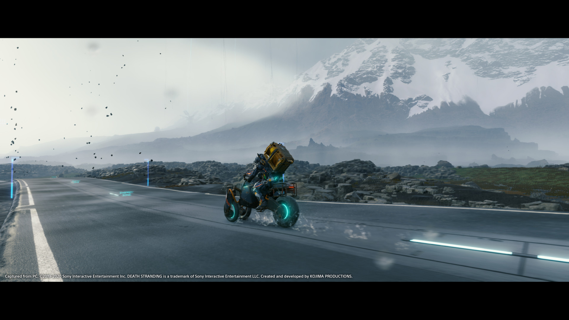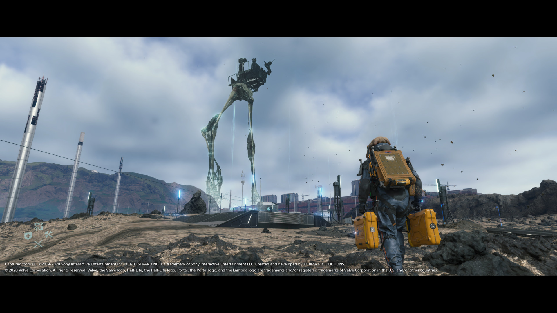 Now that we’ve got whatever all that is out of the way, let’s focus on the gameplay, shall we? Early on in Death Stranding, Sam walks around on foot as he accepts orders to take from one outpost to another. Out in the world you come across packages and materials to collect. You typically carry everything on Sam’s back, but can also attach a single small package to each shoulder and hip. Later on, he gets access to vehicles that can store cargo as well, but going on foot is the best way to deal with all manner of terrain.
