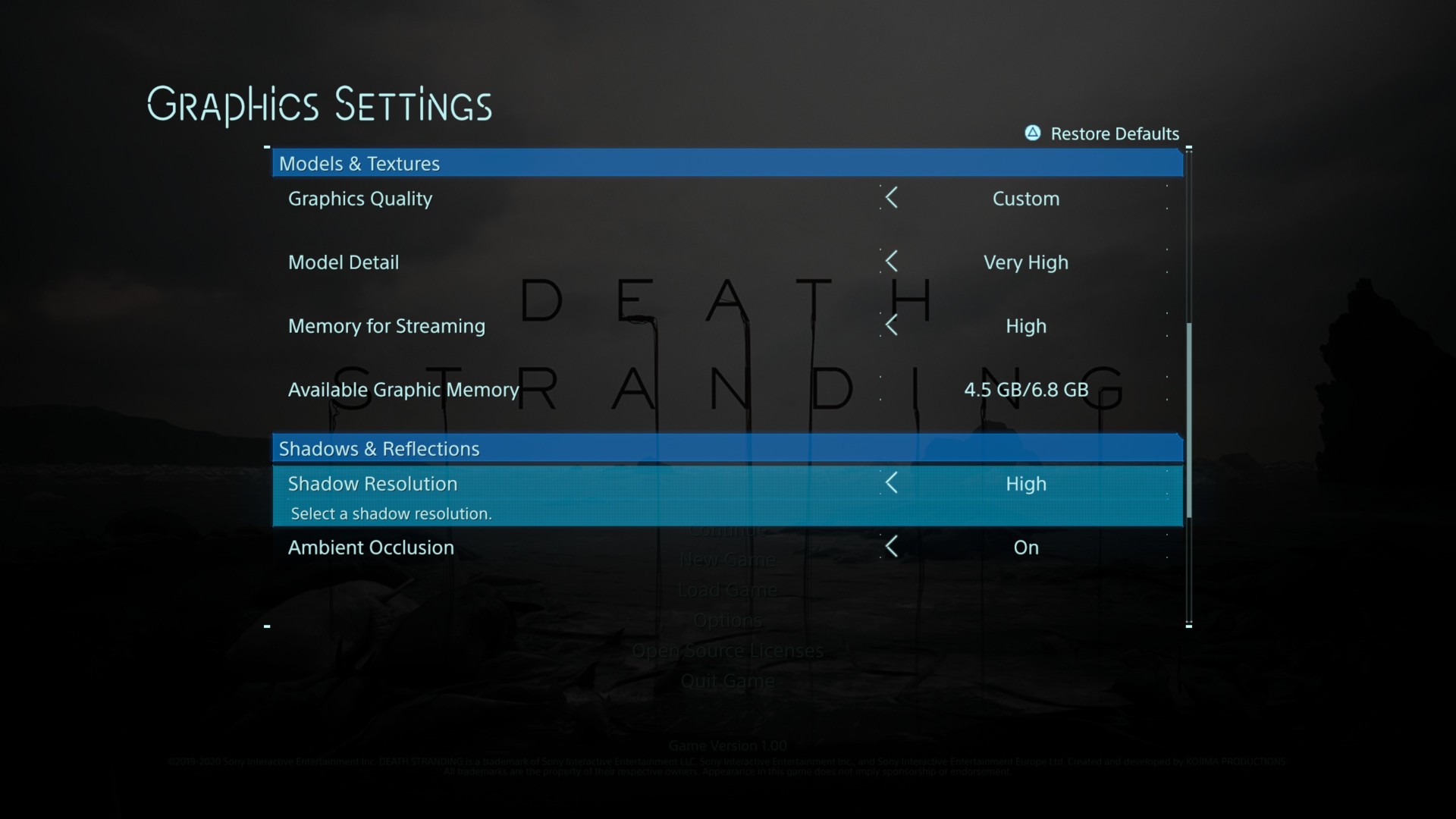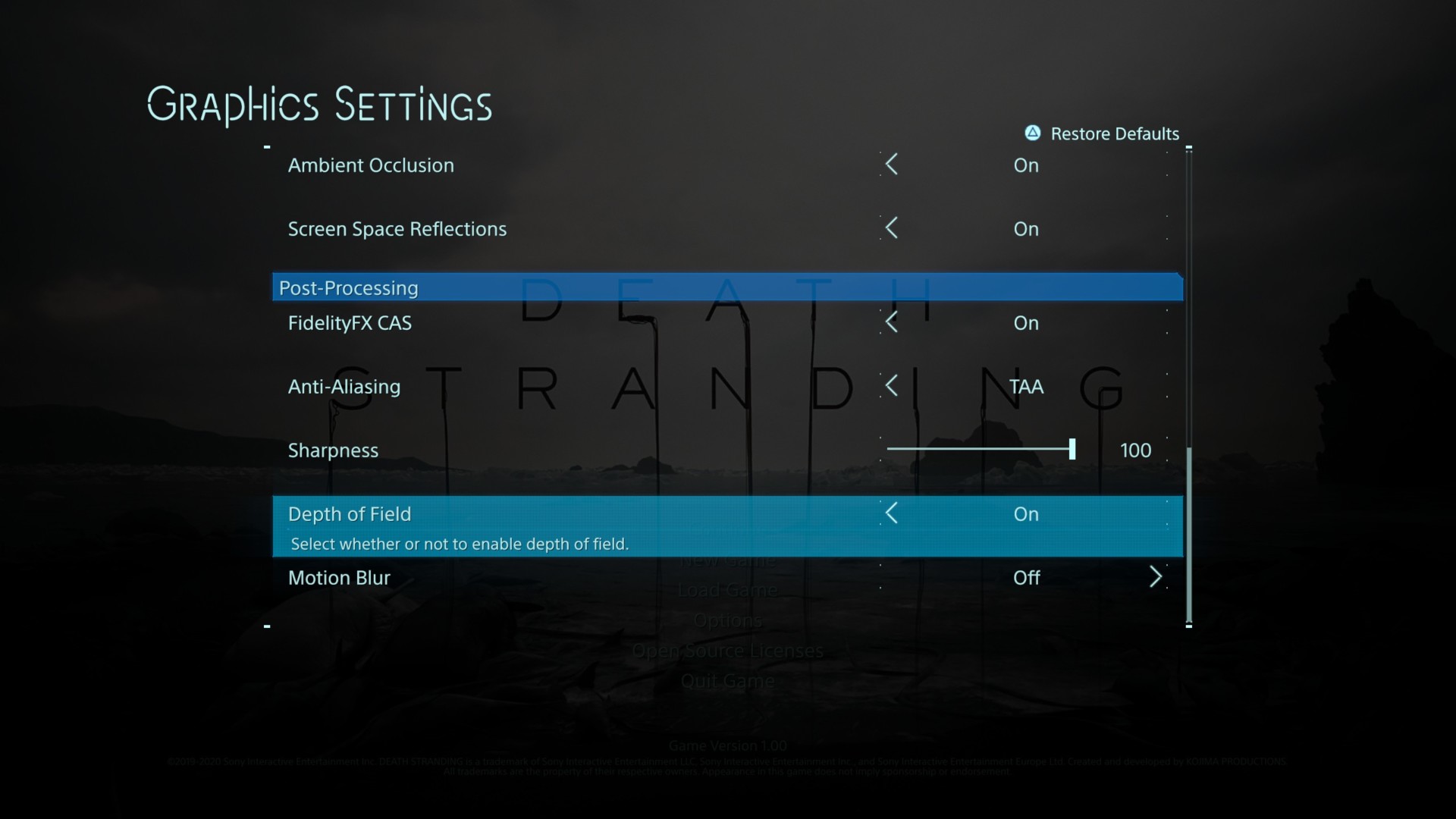 Death Stranding has the usual suite of options, plus a few nice little extras. Here’s what we’ve got to work with: