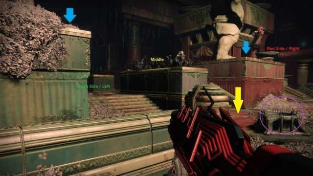 If your team isn’t having issues playing defense, then, rather than stacking up next to the cauldron (yellow arrow), you can simply stand on the statue platforms to the left and right side of it (blue arrows). Have your fireteam leader call out when people need to stack next to the cauldron once more to switch the blessing.