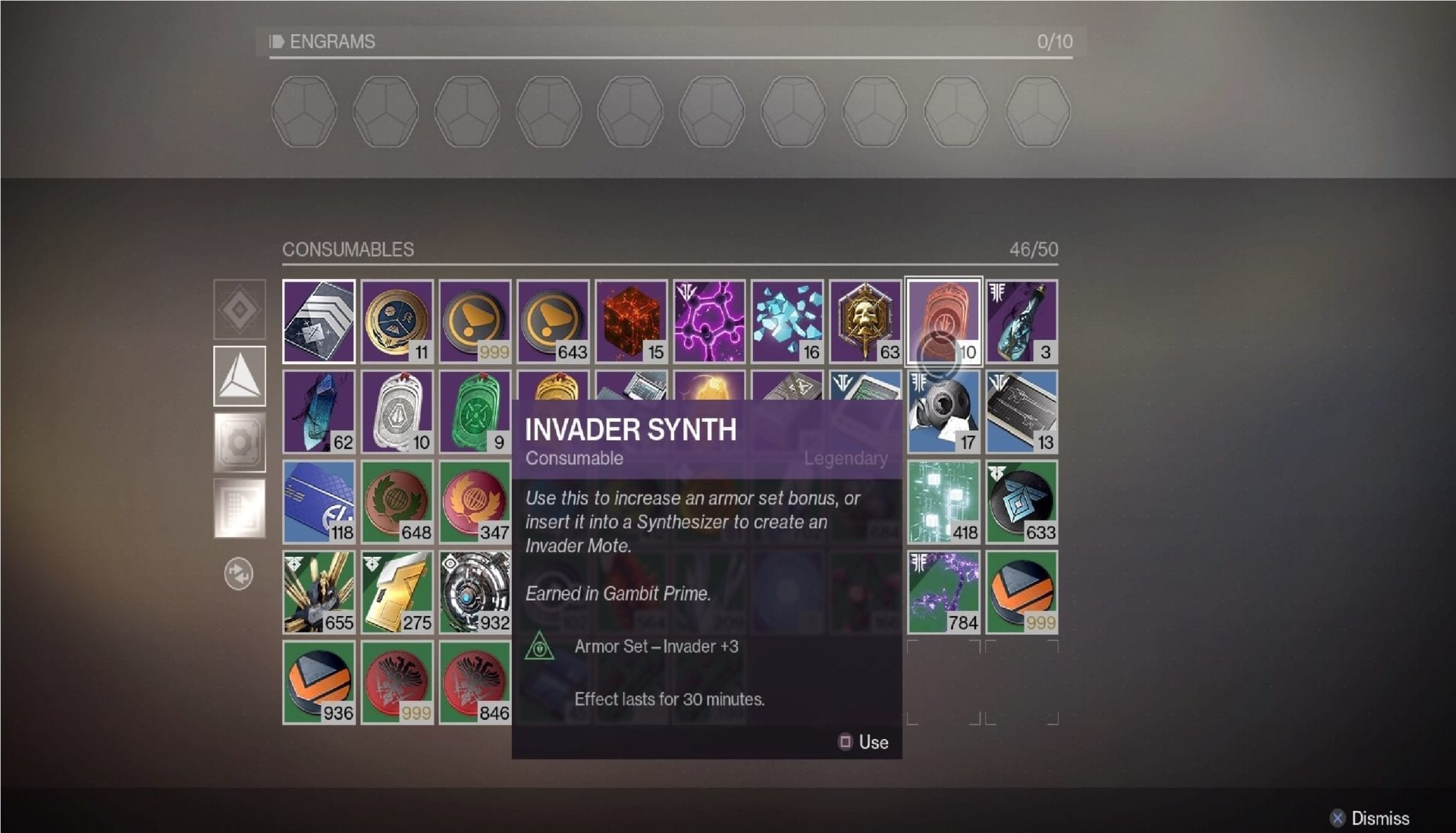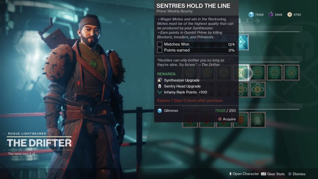 Completing bounties from the Drifter, or certain actions during a Gambit Prime match (ie. killing high-value targets, banking lots of motes) will award you with synths. These can be used later in The Reckoning activity to obtain Gambit Prime armor sets. Check out our Reckoning guide here.