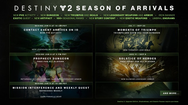 Note: Destiny 2: Season of Arrivals was originally slated to run from June 9 to September 21 (just before the release of the Beyond Light expansion). However, the expansion has been delayed and will now launch on November 10. You can view this season’s content drop calendar below: