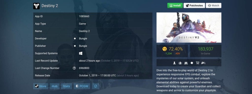 Here, I’ll present a couple of screenshots from Destiny 2‘s SteamDB page. First, this was how things looked like around 4 p.m. EST: