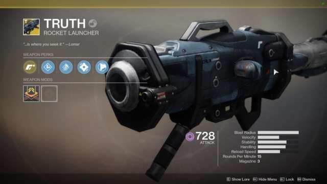 The Truth exotic rocket launcher still has its perks from Destiny 1, which is great. The big news to factor in is that its Destiny 2 iteration has three rockets in the mag already! This was similar to its Destiny 1 (Year 1) version when it was, bar none, the best PvP rocket launcher in the game. Yowza!