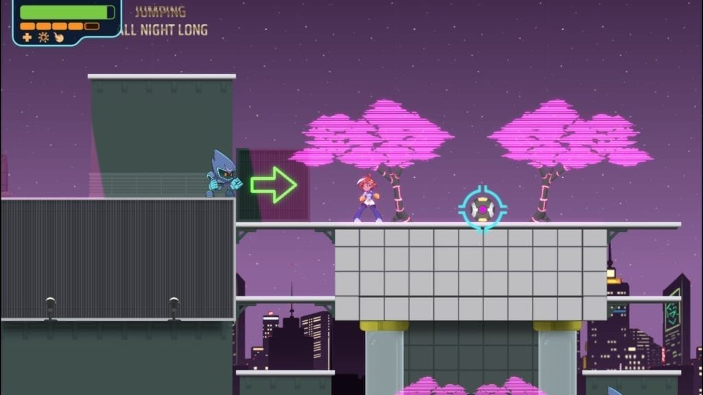 As far as gameplay goes, Double Cross initially allows you to select one of nine levels divided across three different planets. There’s a goo planet with blobs of gel, a planet with an 80’s neon Japan vibe complete with robot ninjas, and a wasteland planet overrun with dinosaurs. You’ll primarily be doing two things in all of these: platforming and fighting. The platforming is fine for the most part. The movement feels a bit too slippery, but it generally works as it should. The unique travel mechanic involves the Proton Slinger, which allows Zahra to grab onto anchor points to launch herself around.