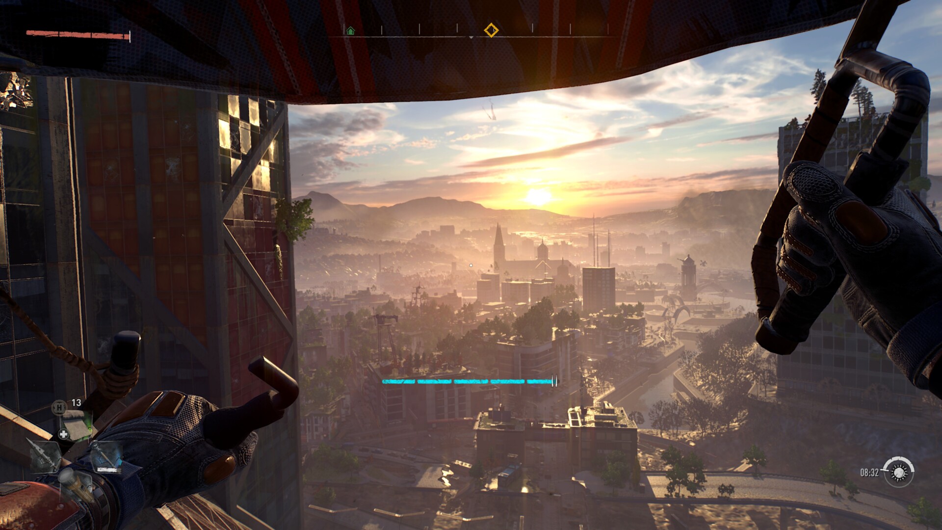 Villedor, also known as The City, is where most of Dying Light 2 Stay Human takes place. Visually, I have few qualms here. Towering skyscrapers, ruined houses, military checkpoints, and irradiated wastelands dot the massive, open-world landscape. You’ll find a lot of loot stashed around, various challenge tasks, and Inhibitor Containers (used to level up your health and stamina). Likewise, there’s an unrivaled feeling of joy once you obtain the grappling hook and paraglider, allowing you to swoop and zip across distances with ease.