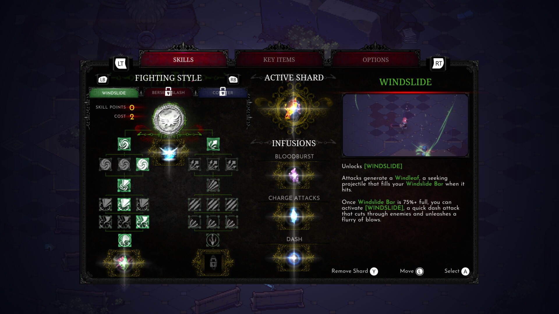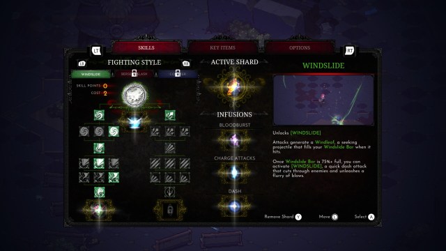 You may only have one fighting style active at any given time, though you can freely switch whenever you want to. Moreover, each fighting style has a couple of skill trees that you can dump points in, as well as nodes that let you socket shards. These shards are dropped by specific bosses and they grant special effects, from teleports and free dash moves to generating corruption on the ground that can heal you and damage your foe. All these systems make for added flexibility in your choices. Personally, I preferred the Windslide branch with several socketed shards that can help with healing.