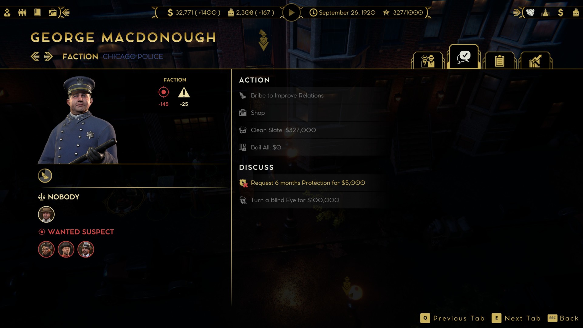 The problem, however, was that Empire of Sin‘s sandbox remained all too similar. You start out in a particular suburb of Chicago and, as you zoom out, you’re shown an expansive map in a pausable, real-time interface. Next, you recruit more gang members, and then you take over various “rackets.” Likewise, you could ransack or raze locations held by random thugs (minor factions), or just buy vacant buildings. From there, you upgraded facets such as ambiance and word of mouth to keep customers coming in, security to have extra guards, and deflection to prevent police raids.